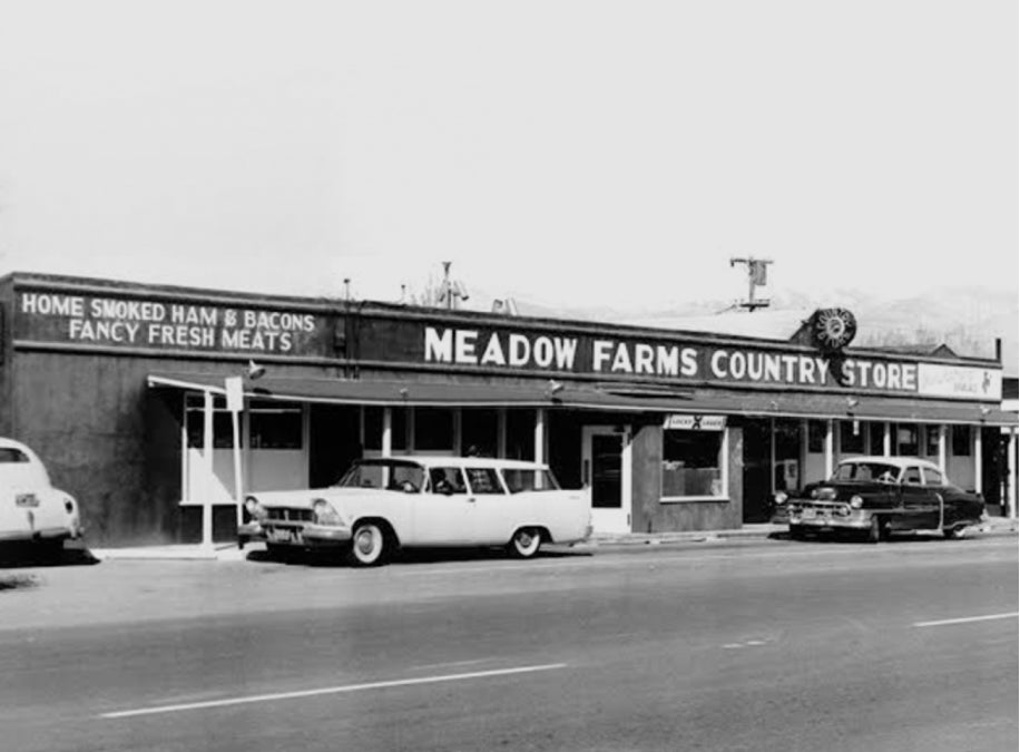 It was a man called "Wally" who named this store and area "Meadow Farms," back around 1922. He started the business of smoking hams and bacon with 300-year-old mountain mahogany logs just for the local folks. The mahogany smoked taste was an immediate success and thanks to the many tourists in this beautiful High-Sierra country, the word traveled.
